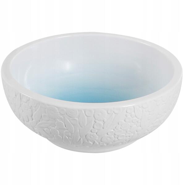 • Felületkezelés: külseje selyem-matt hófehér, belső medencéje mély óceánkék, kézzel felvitt arany szegéllyel; háromlépcsős, 1200 °C-os égetéssel rögzítve