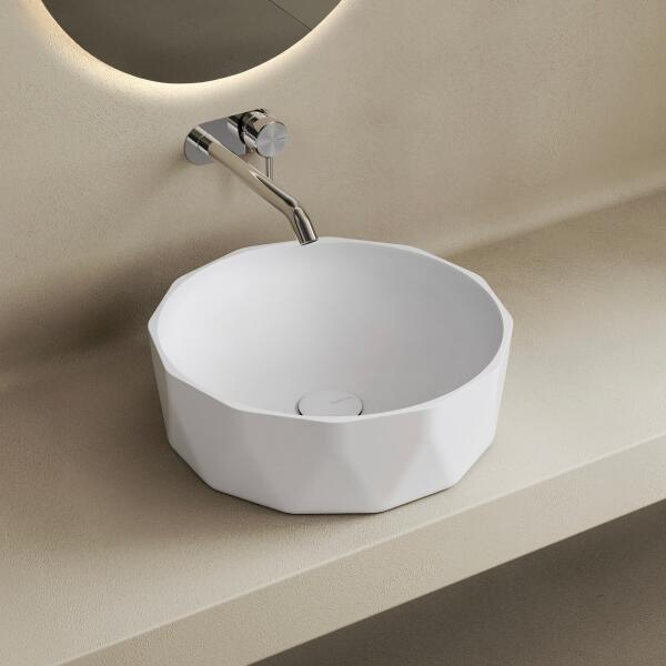MARMY FIORE D40x14 MATT mosdó - DESIGNED IN  ITALY Ez a mosdó FÉNYES FEHÉR színben is elérhető. A mosdón NINCS csaplyuk,  TÚLFOLYÓ NÉLKÜLI  változatban kapható. A KLIK-KLAK lefolyó nem tartozék, megtalálhatóak a KIEGÉSZÍTŐK menüpontban. Pultra szerelhető vagy fali csapteleppel ajánljuk. Rögzítése történhet pultra, illetve kifejezetten erre a célra gyártott bútorlapra. Tervezéskor nagy hangsúlyt kell fektetni a pult megfelelő magasságának megválasztására. A mosdó látható peremmagassága, pultra ültetés után  14 cm .   Az IMAGE képek illusztrációképp szolgálnak, a mosdó belső kialakítását segít jobban elképzelni.
