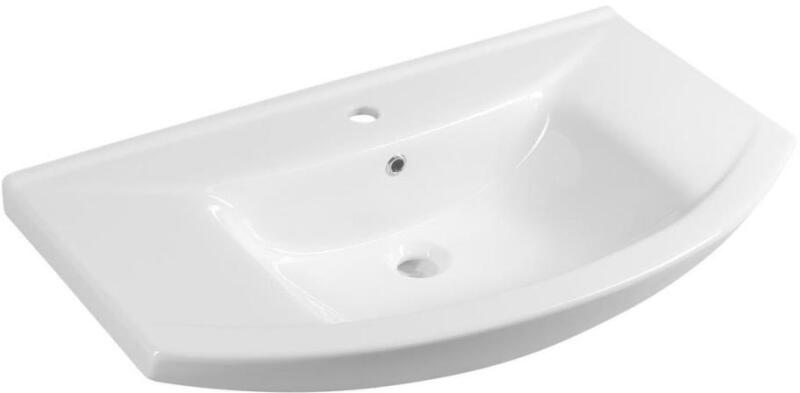 Kerámia mosdó, mérete: 86x50 cm. Bútorra szerelhető kivitel. A mosdón egy csaptelep-furat és egy túlfolyó található.